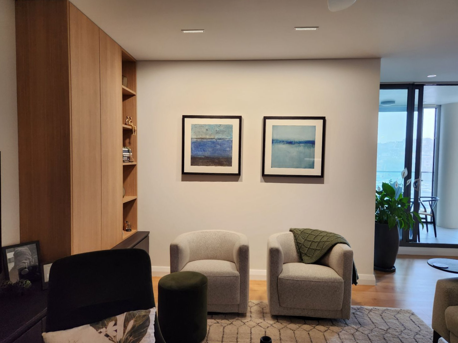 This dark corner was a particular challenge. The team tested a downlight over the sitting area, but the wallwash technique proved better again: less glare, and nice focus on the artworks.