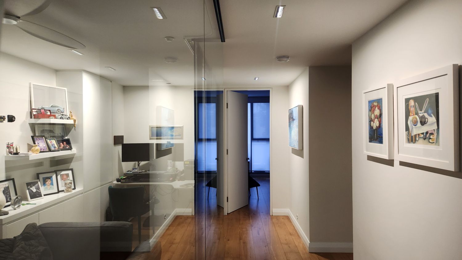 This study nook receives no natural light and is backed by a glass wall to make sure it doesn’t feel poky. Compar wallwashers either side of the glass wall shine light on the photo display and the corridor artwork, but do not reflect in the shiny intermediate surface. The owners look and this now and say, “I’m never installing a downlight again.”