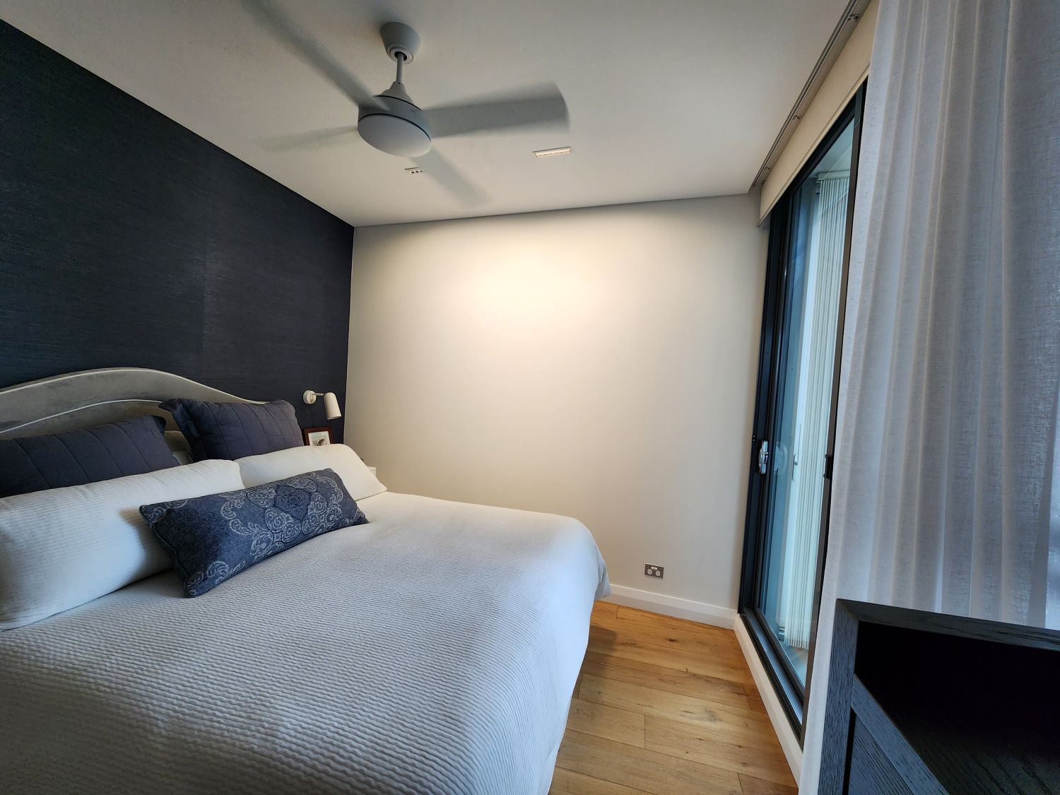 Ceiling fans are most effective installed above the living space. In the relatively small confines of a bedroom, that restricts lighting options. You can’t have the light concealed by the fan blades, or worse still caused to flicker. Just two Compar wallwashers provide all the general light needed in the Master suite, complemented by picture windows and decorative bedside lamps.