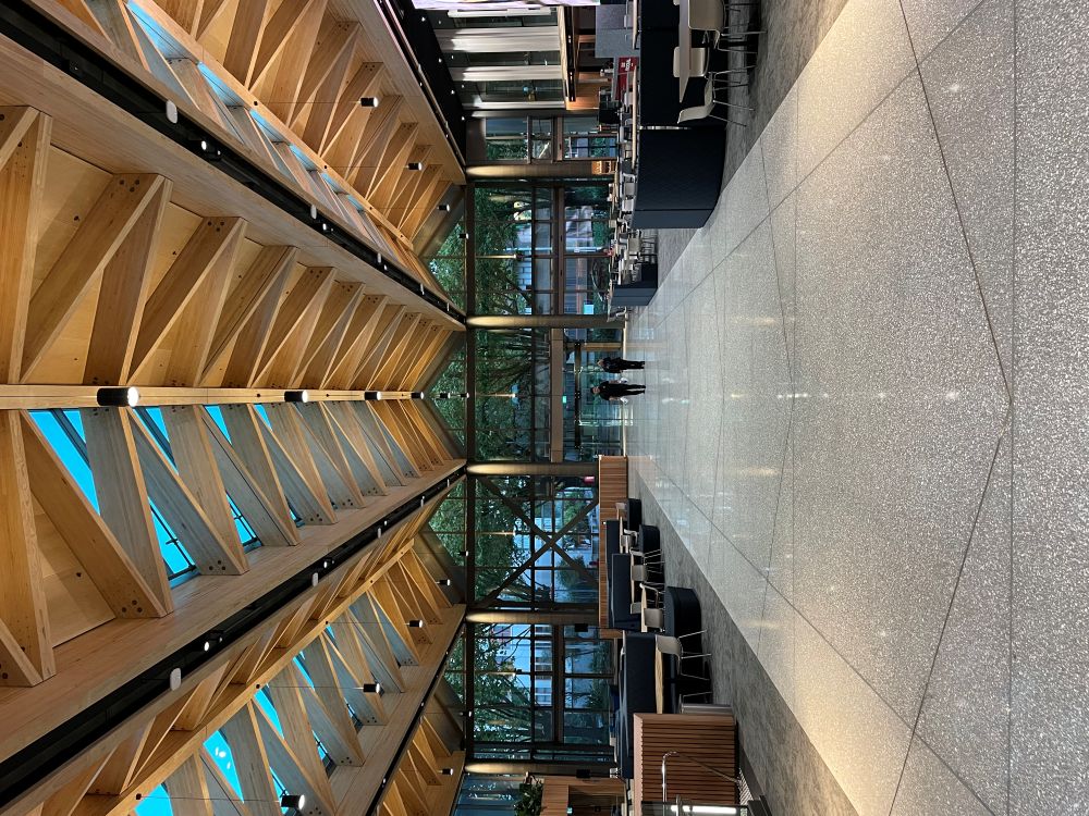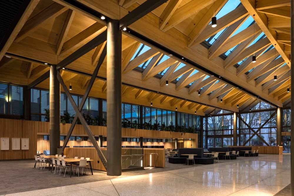 Lighting specialists, Beca, selected ERCO’s Atrium pendants for the main spaces. These luminaires combine powerful, low-glare downlighting with indirect uplight which highlights the patterned ceiling. Warm tones and excellent colour rendering complement the timber beams, while discreet Parscan spotlights accentuate columns and architectural details. A neutral 3500K colour temperature harmonises with the abundant daylight, and flexible controls allow tailored lighting scenes for different activities.