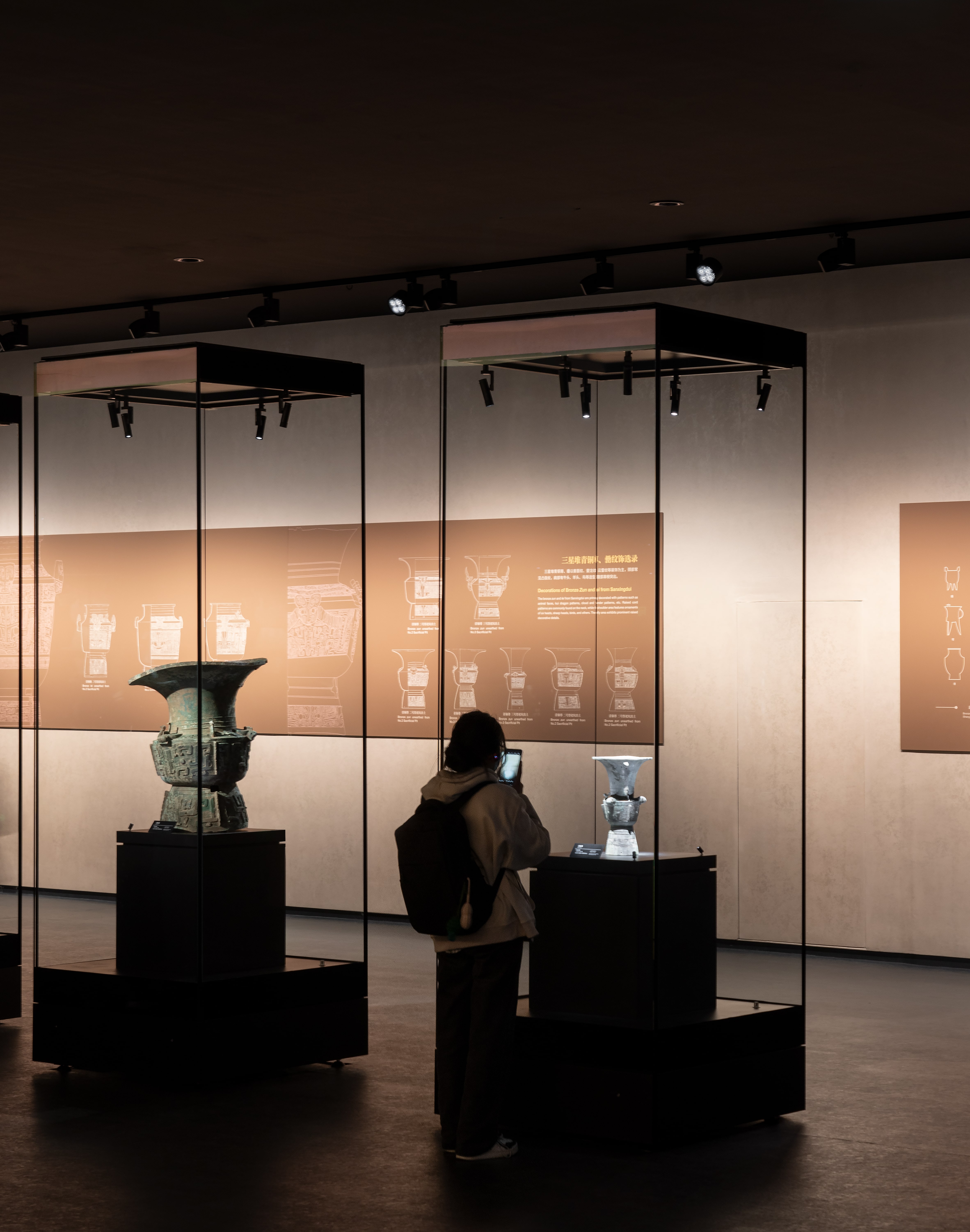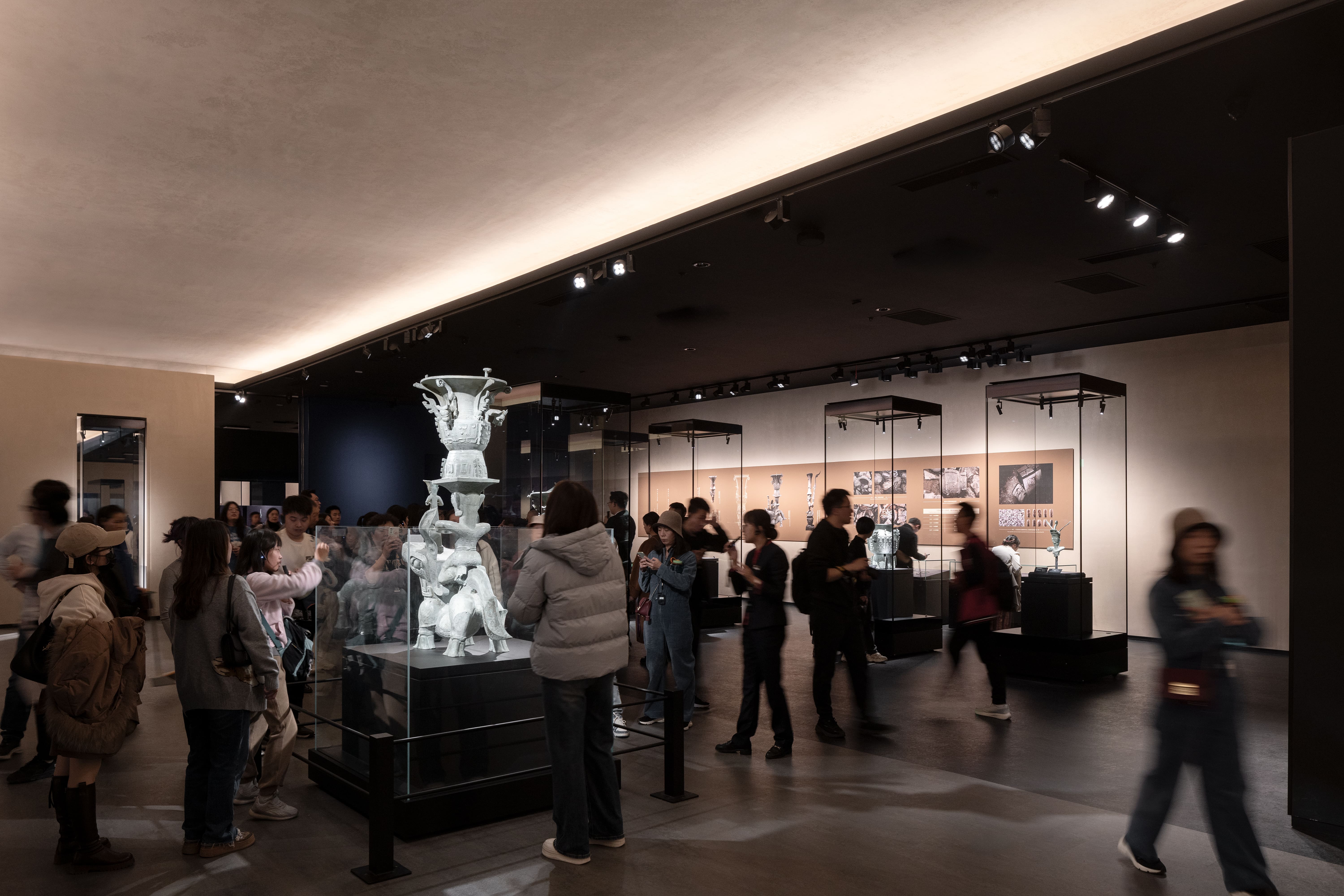 除展柜照明外,轨道照明系统也被用于塑造整体空间氛围。通过对对比关系的精细控制,展厅在明暗之间形成节奏变化,引导观众在空间中自然移动,逐步展开对三星堆文明的理解。