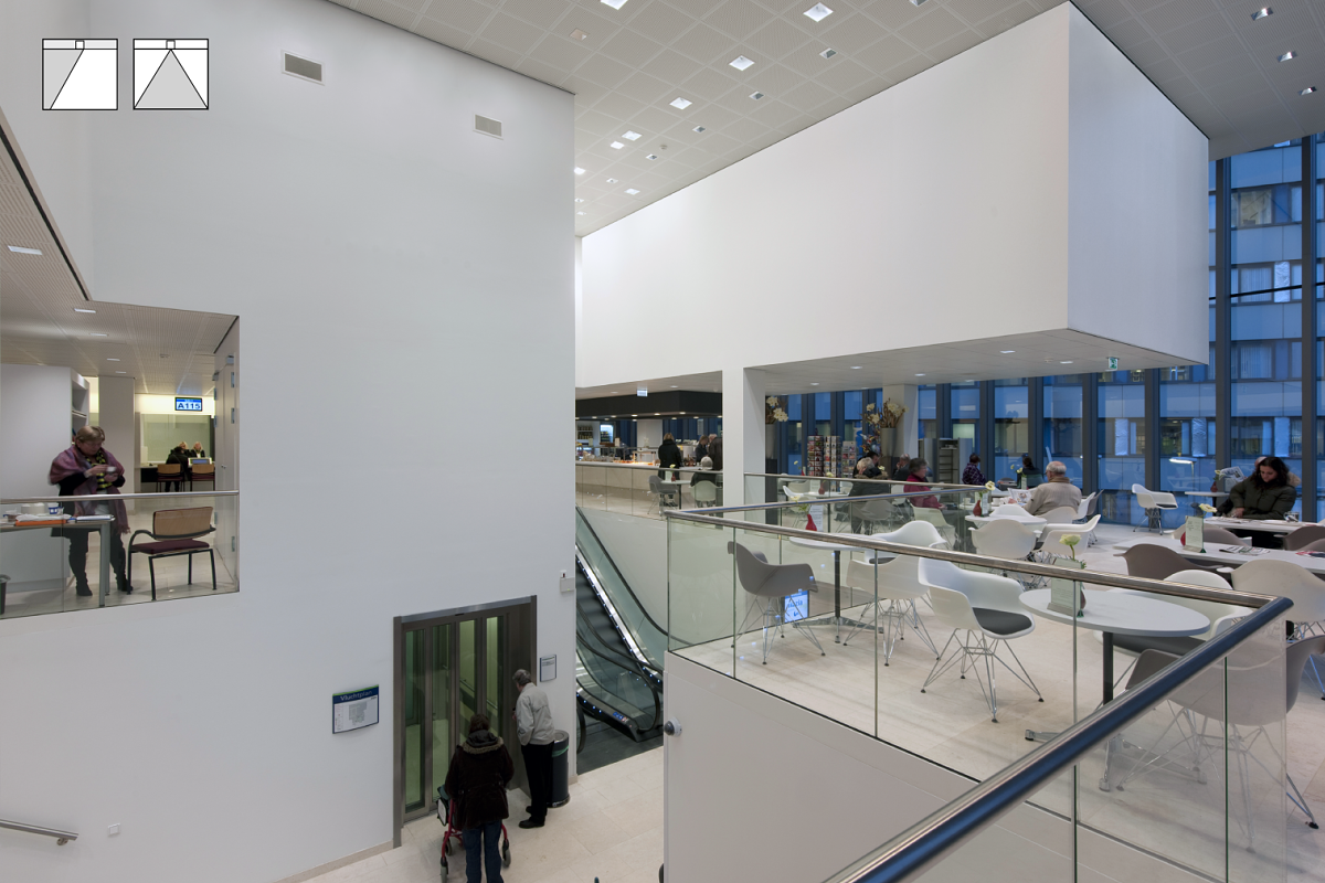 The foyer of the Ikazia hospital in Rotterdam perfectly demonstrates the principles of perception-orientated lighting in a specific application within a public building. The lighting concept combines vertical lighting with horizontal general lighting. In this way the room is structured via light and differentiated into foreground and background. The luminaires integrated into the ceiling provide the ceiling design with structure in a discreet way.