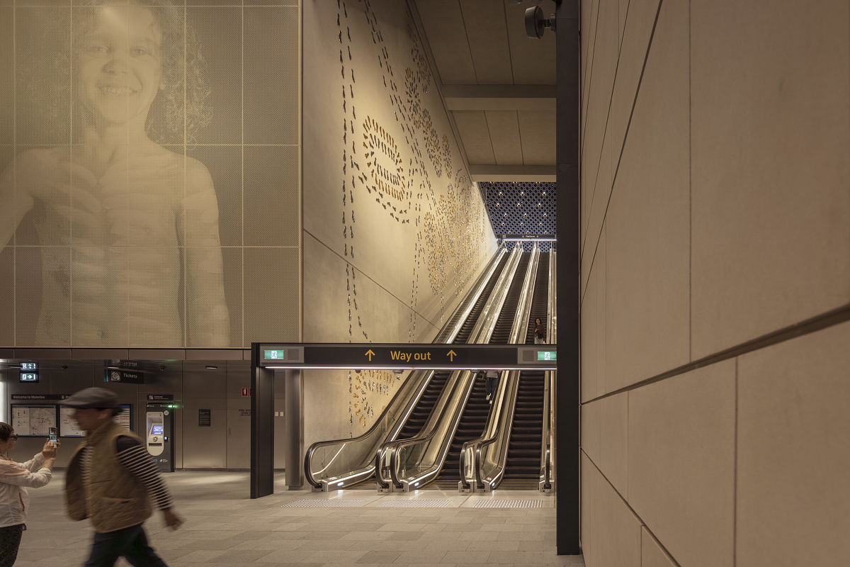 Art is seen as a way to enrich the commuter journey. It aids the identification of a site, can help to acknowledge aspects of a site’s past, and works to make places interesting and engaging. Best practice urban design is complemented by artistic commentary: Metro Art is Sydney Metro’s vision to incorporate relevant art into each station – either newly commissioned or relocated from elsewhere in the city.