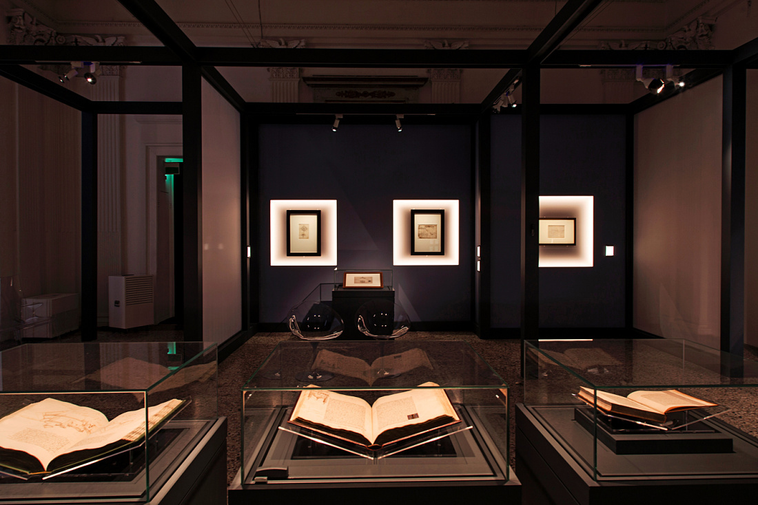 The exhibition was illuminated using dimmable ERCO Pollux spotlights in 6W, with an output of 630lm and 3000K. Pollux contour spotlights are designed for precise adjustment of the beam to suit the format of a painting. With an intuitive framing attachment, the beam of each track-mounted spotlight is quick and easy to adjust, achieving maximum flexibility. Thanks to the compact housing, the luminaire itself recedes discreetly into the background, focusing the attention entirely on the lit effect. With a spectrum free of IR and UV components, LED light meets all the curatorial requirements, making it ideal particularly for the illumination of valuable historic artwork – such as created by Leonardo da Vinci.