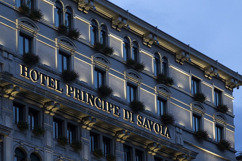 Established in 1927, the Principe di Savoia has long become a landmark in Milan and one of the world’s foremost luxury hotels. Overlooking the Piazza della Repubblica, just a stone’s throw from the famous La Scala opera house and Milan Cathedral, it has been frequented over the decades by a long line of senior politicians, royalty, business moguls and showbiz stars. Among its most prominent guests were Queen Elizabeth II, Aristoteles Onassis, Henry Ford, David Rockefeller, Evita Peron and Elizabeth Taylor, who resided at the five-star establishment that, in 2003, became part of the Dorchester Collection owned by the Brunei Investment Agency. It was the latter who commissioned the Italian architect and light artist Marco Nereo Rotelli with the creation of a contemporary lighting concept that would dignify the magnificent neoclassical façade that rises up ten storeys.