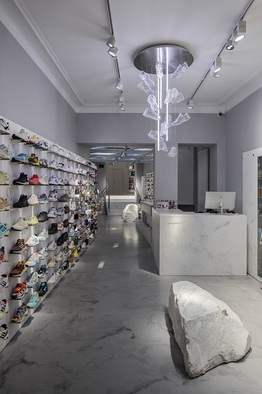 In the era of online retailing, shop owners attempt to offer more to make the shopping experience in stores appealing to customers. Overkill Cologne has perfected this, functioning as a store for sneakers, an exclusive boutique and an art gallery. That is the essence of Overkill. Across 145m2, the store demonstrates its love for streetwear with displays of merchandise that resemble exhibitions of art. In addition to Italian marble and pictorial art, light is an essential part of the expressive interior concept. With powerful wallwashing and precise accentuation, wirelessly controllable ERCO spotlights radiantly display streetwear and art.