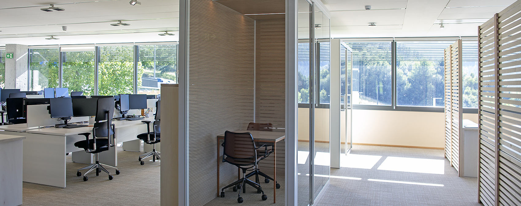 The spaces have been reorganized to offer friendlier and more flexible environments, with current technology and areas that promote collaboration and well-being: a renovated main entrance, the recovery of the original staircase, a square on the first floor as a meeting place, and a terrace on the third floor to enjoy the surroundings. The upper floors prioritize natural light and views, while the interior layout incorporates individual cabins, meeting rooms, videoconferences and common areas adapted to different uses.