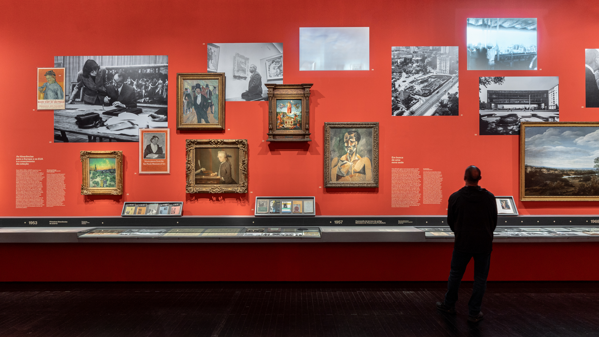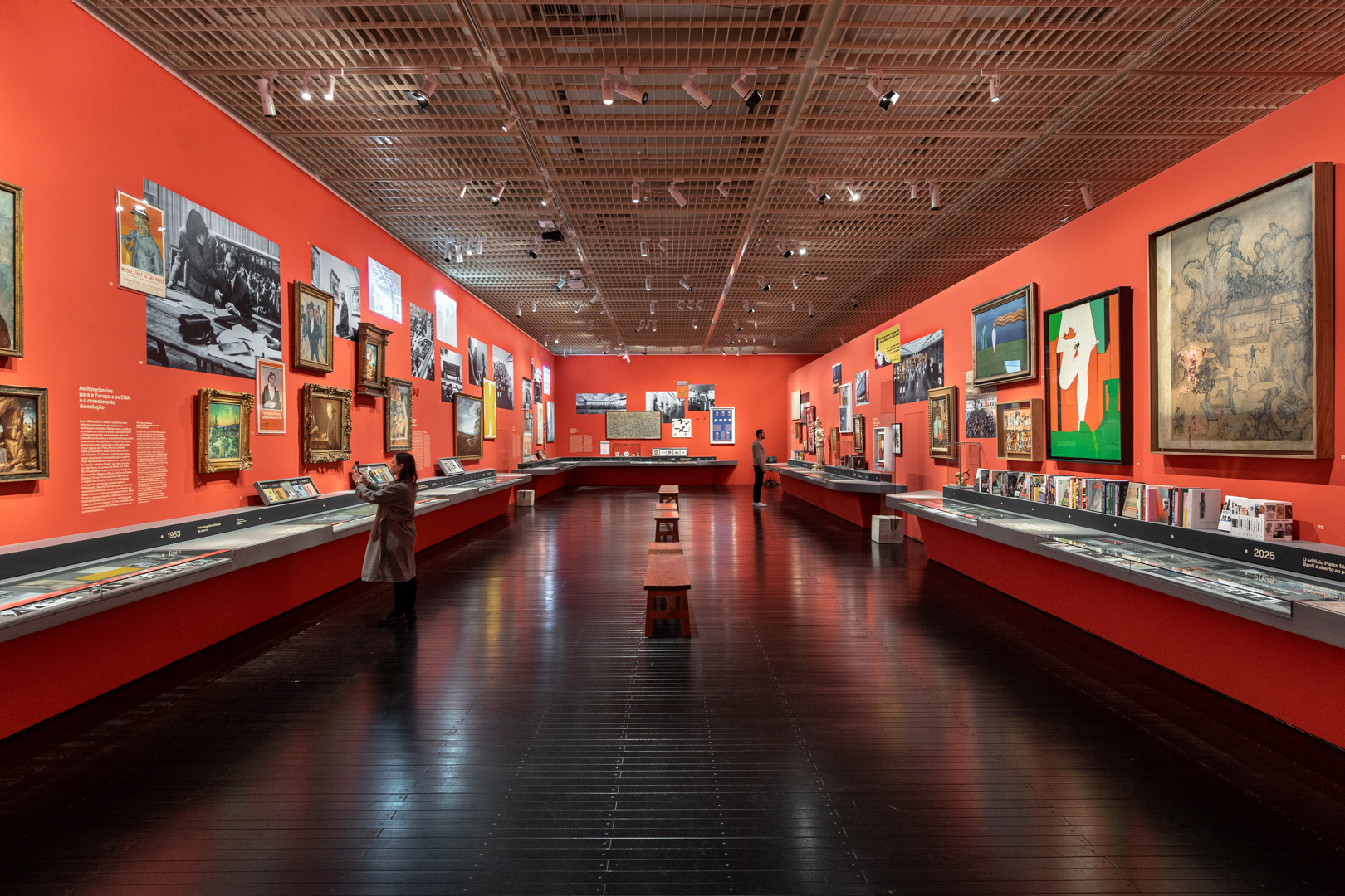En la sala roja, dedicada a contar la historia del MASP, se logró un equilibrio lumínico entre la iluminación general del espacio y la iluminación puntual de las vitrinas. El trabajo minucioso de iluminar las vitrinas desde arriba, con niveles similares al las paredes, permitió mantener una coherencia visual sin necesidad de aumentar la potencia, incluso en superficies de color rojo intenso. Esta estrategia, fundamentada en los principios de percepción visual humana, permitió alcanzar una alta eficacia con niveles de luz reducidos.