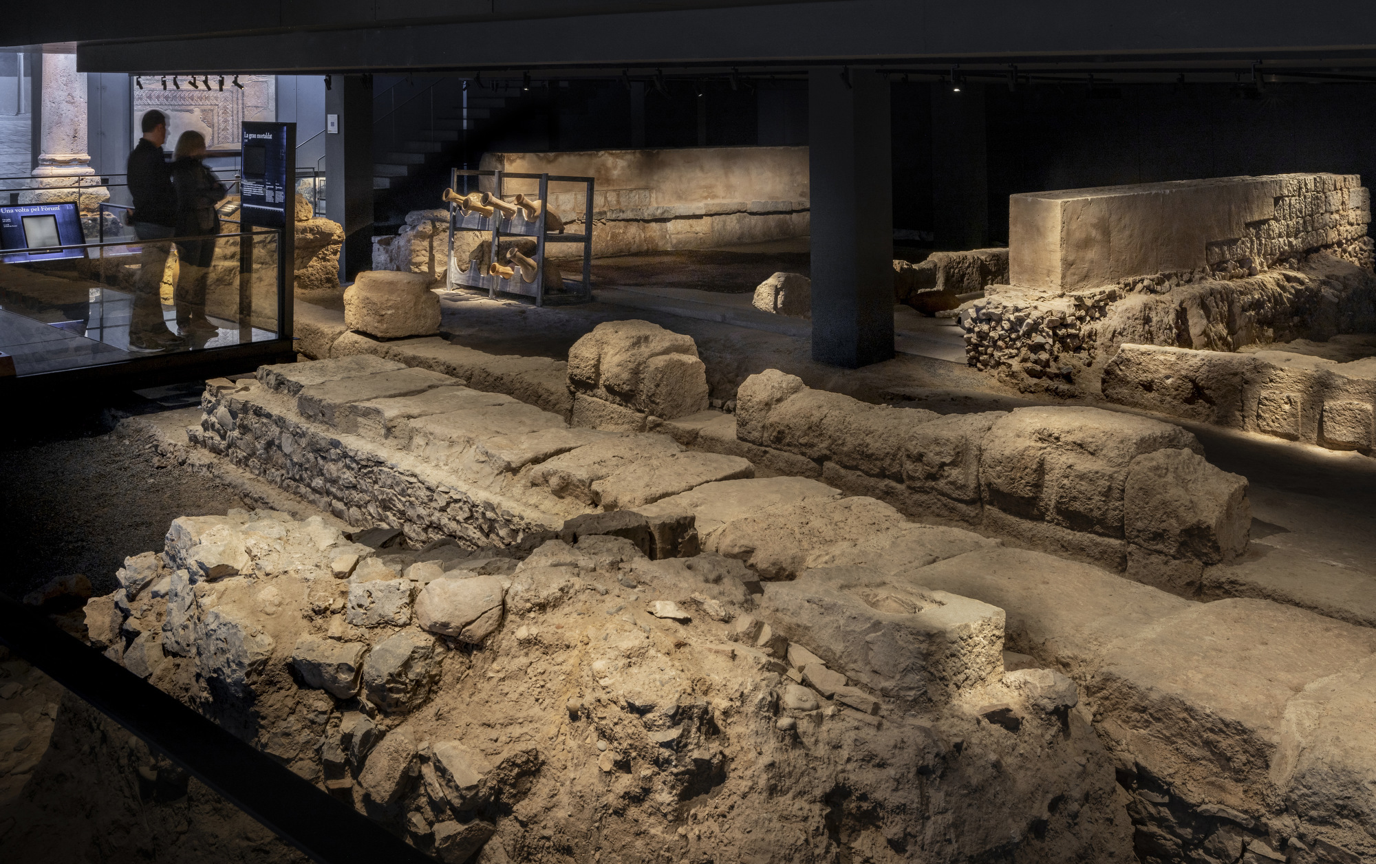 A lo largo del conjunto, la luz define escalas, delimita ámbitos y construye profundidad. Los haces precisos permiten aislar detalles —por ejemplo, pequeñas piezas domésticas como tinajas o fragmentos constructivos—, mientras que distribuciones más abiertas ayudan a comprender la estructura espacial de los restos. La luz rasante levanta planos verticales y hace perceptibles límites arquitectónicos hoy fragmentados. Esto refuerza la lectura de muros, basamentos o columnas sin necesidad de reconstrucción física.