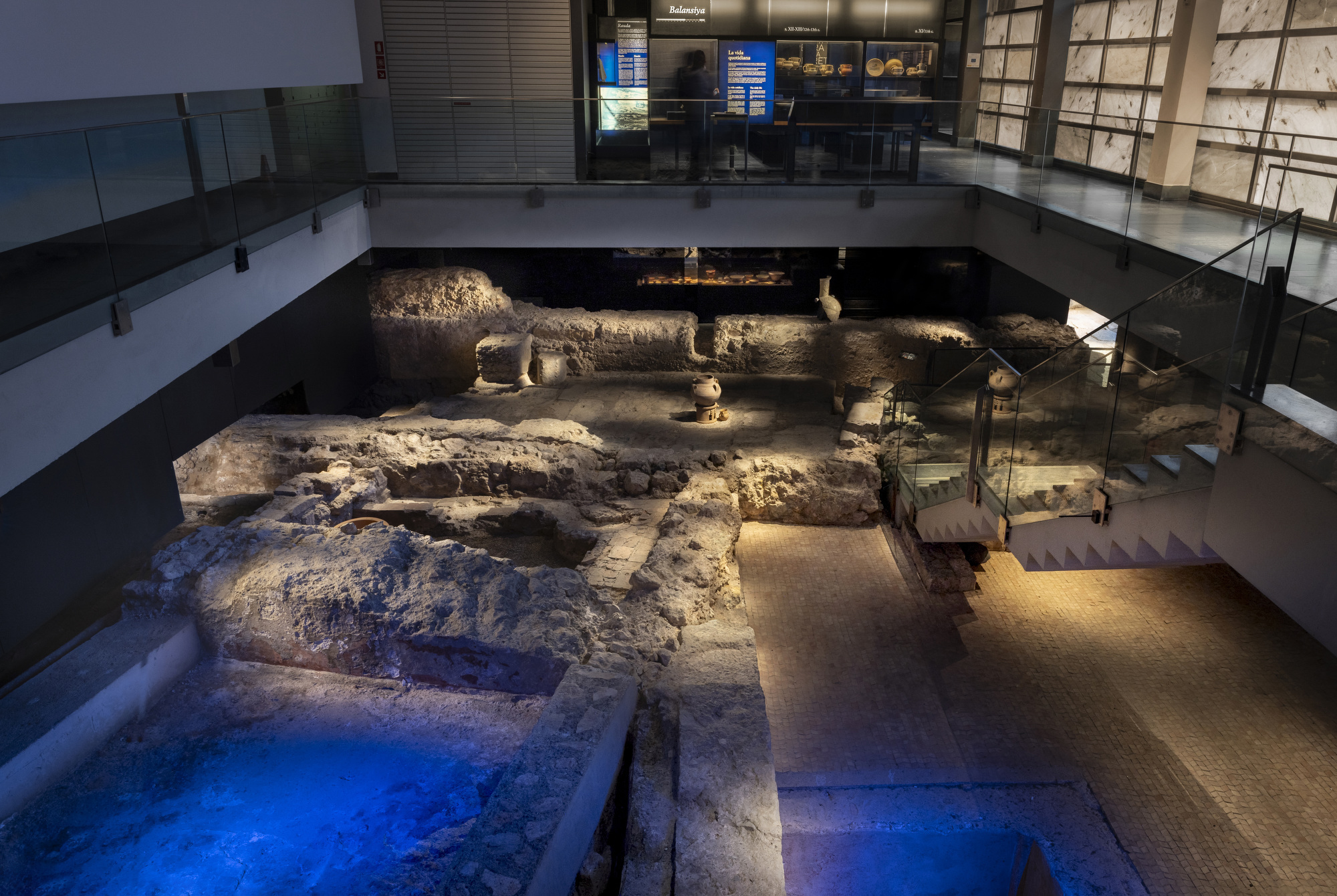 De forma puntual, el uso de acentos de luz azul —mediante RGBW— permite identificar y diferenciar determinados elementos del yacimiento, como vasijas o áreas concretas (por ejemplo, las termas romanas). Este recurso permite crear un contraste cromático controlado que aporta información sin restar protagonismo a la escena.