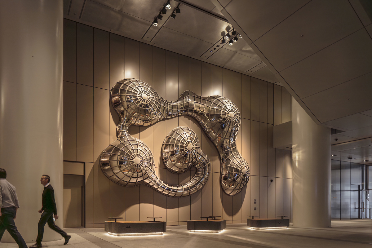 Le hall au-dessus de la station Martin Place, au cœur « civique » de la ville, abrite « The Magic Circle » de Claire Healy et Sean Cordeiro, une installation métallique et de miroirs qui établit des parallèles entre le chaos organisé d’une fourmilière et la vitalité d’une ville peuplée. Des projecteurs ERCO Parscan sur rails conducteurs rehaussent les tons chauds du mur d’exposition cuivré et créent un habile jeu de lumières et d’ombres.