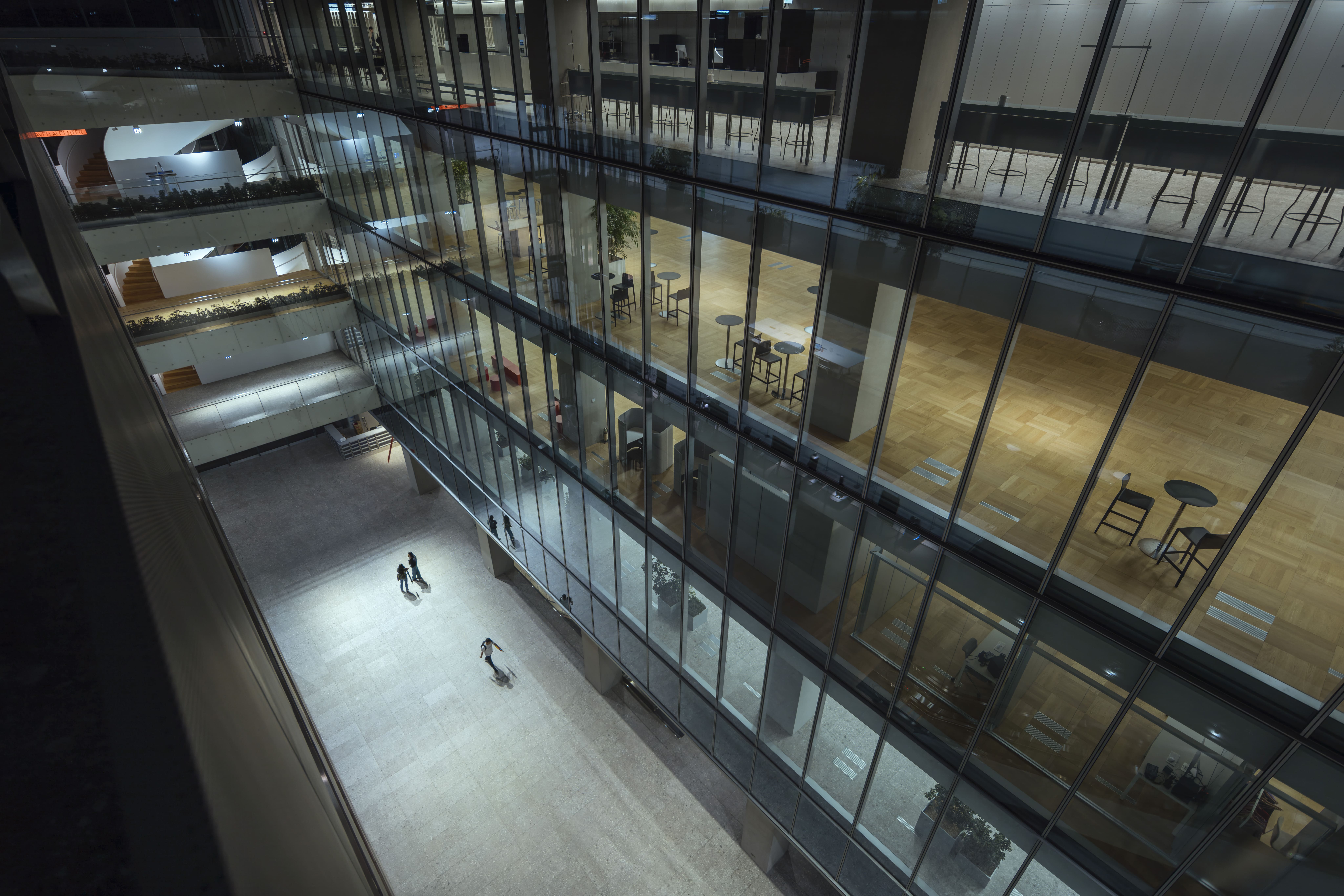 스카이홀은 진정으로 '빛의 언어'를 보여줍니다. 경사진 지붕에 전략적으로 배치된 채광창은 스카이홀을 자연광으로 가득 채워 낮 동안 인공 조명에 대한 의존도를 줄이고 공간의 지속 가능성 노력에 기여합니다. 또한, Hitrac 루미네어에서 제공되는 주변 조명은 천장을 비추고 아래 공간으로 반사되어 부드러운 조명 효과를 생성하며, 경사진 천장의 독특한 건축적 디테일을 강조합니다.