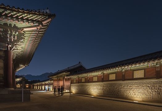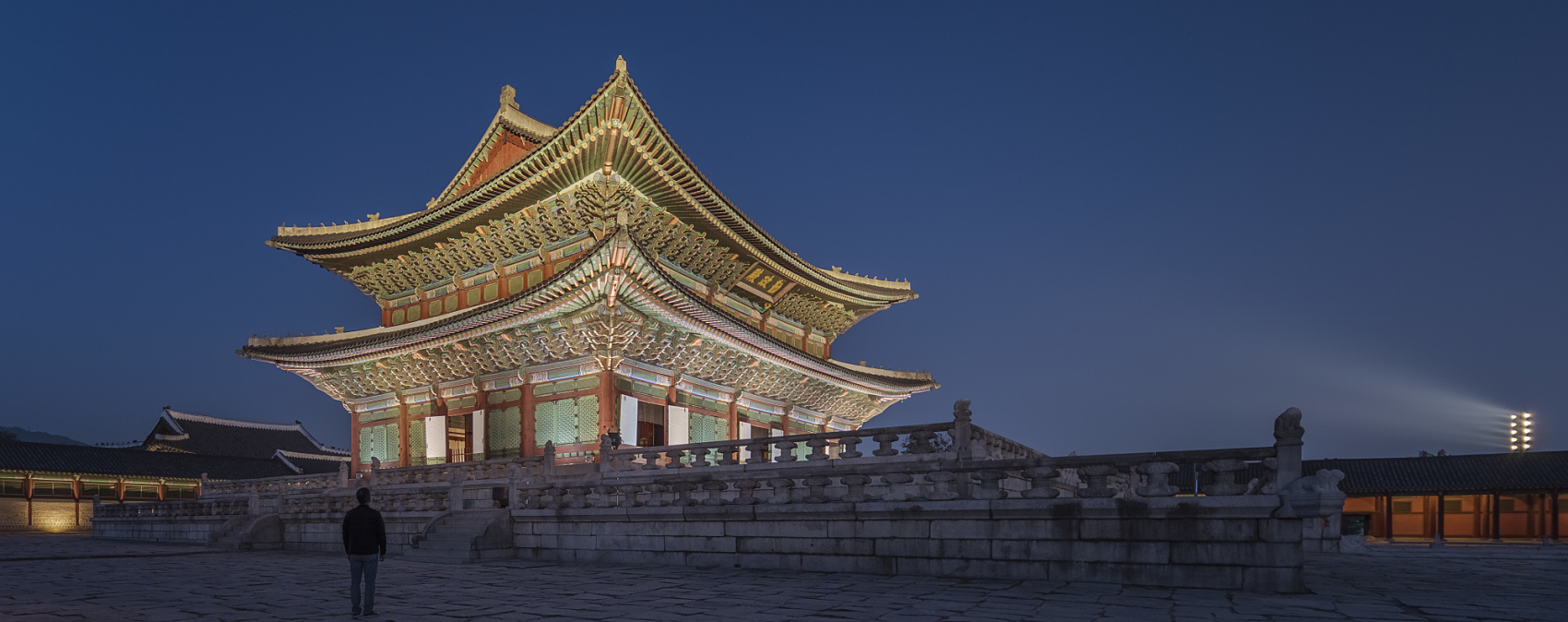 Eens, in de 14e eeuw was dit de imposante koninklijke residentie. Tegenwoordig geldt het Gyeongbokgung Paleis in hartje Seoul als architectonisch meesterwerk in pagodestijl. Het monumentale oord strekt zich uit over een oppervlakte van 400.000m2 en belichaamt eeuwen Koreaanse geschiedenis en traditie. Als toeristische attractie trekt het paleis miljoenen bezoekers uit de hele wereld aan. Op die plaats schept licht van ERCO een magische sfeer die de architectonische details van het gebouw 's nachts benadrukt.