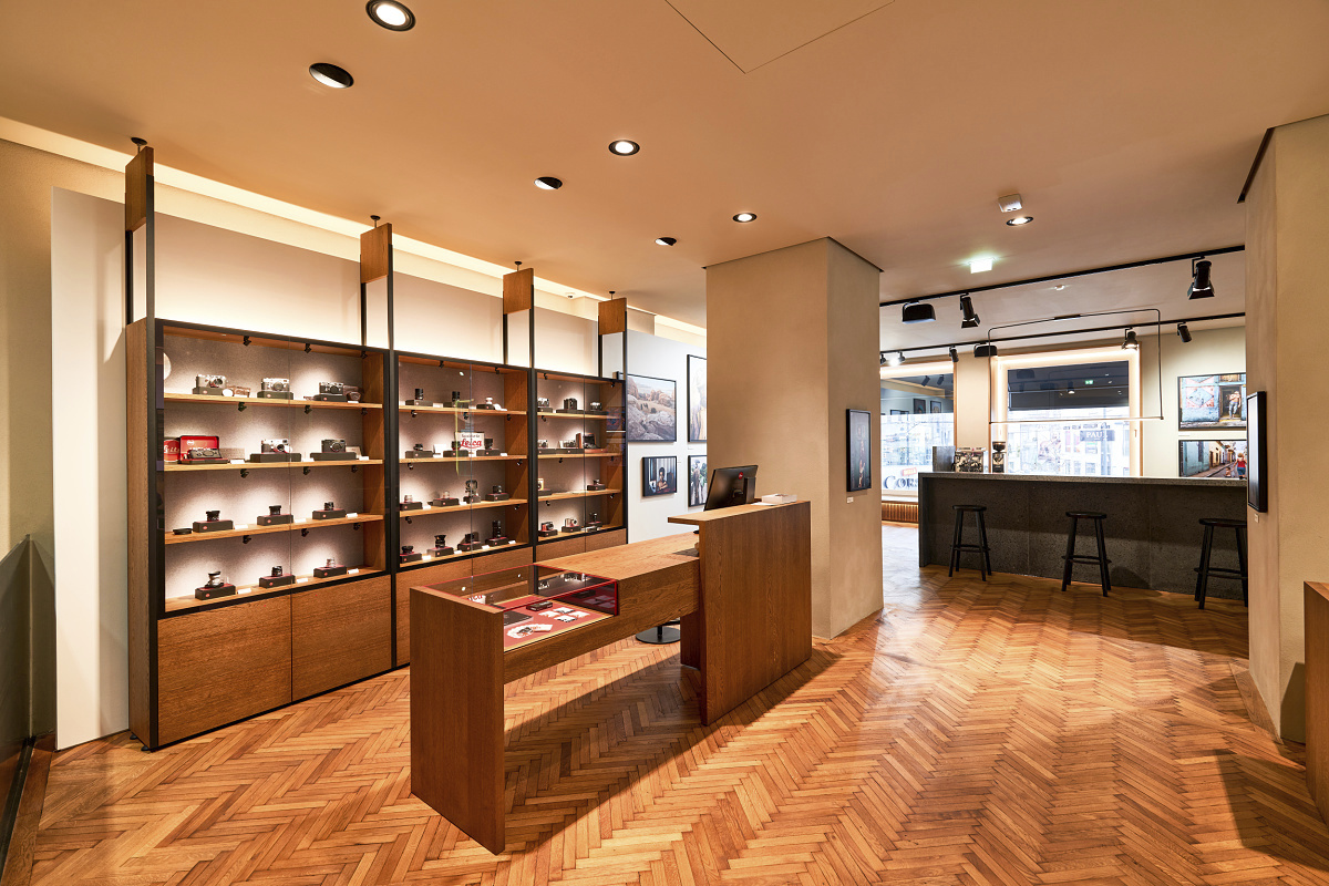 Leica Store Wenen: vitrine met Leica cameras en ERCO verlichting.